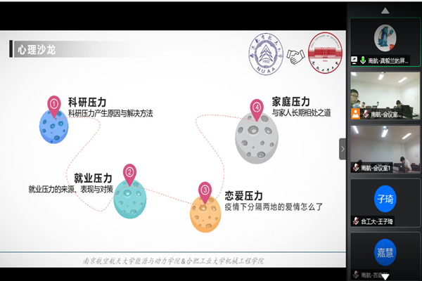 在抗击新冠疫情的特殊时期,为帮助同学们解决居家抗疫期间的学习生活问题,引导同学们建立积极向上的乐观心态,6月8日晚7点,机械工程学院研究生会与南京航空航天大学能源与动力学院研究生会联合开展了“‘新’心相印‘疫’路同行”线上心理沙龙活动。