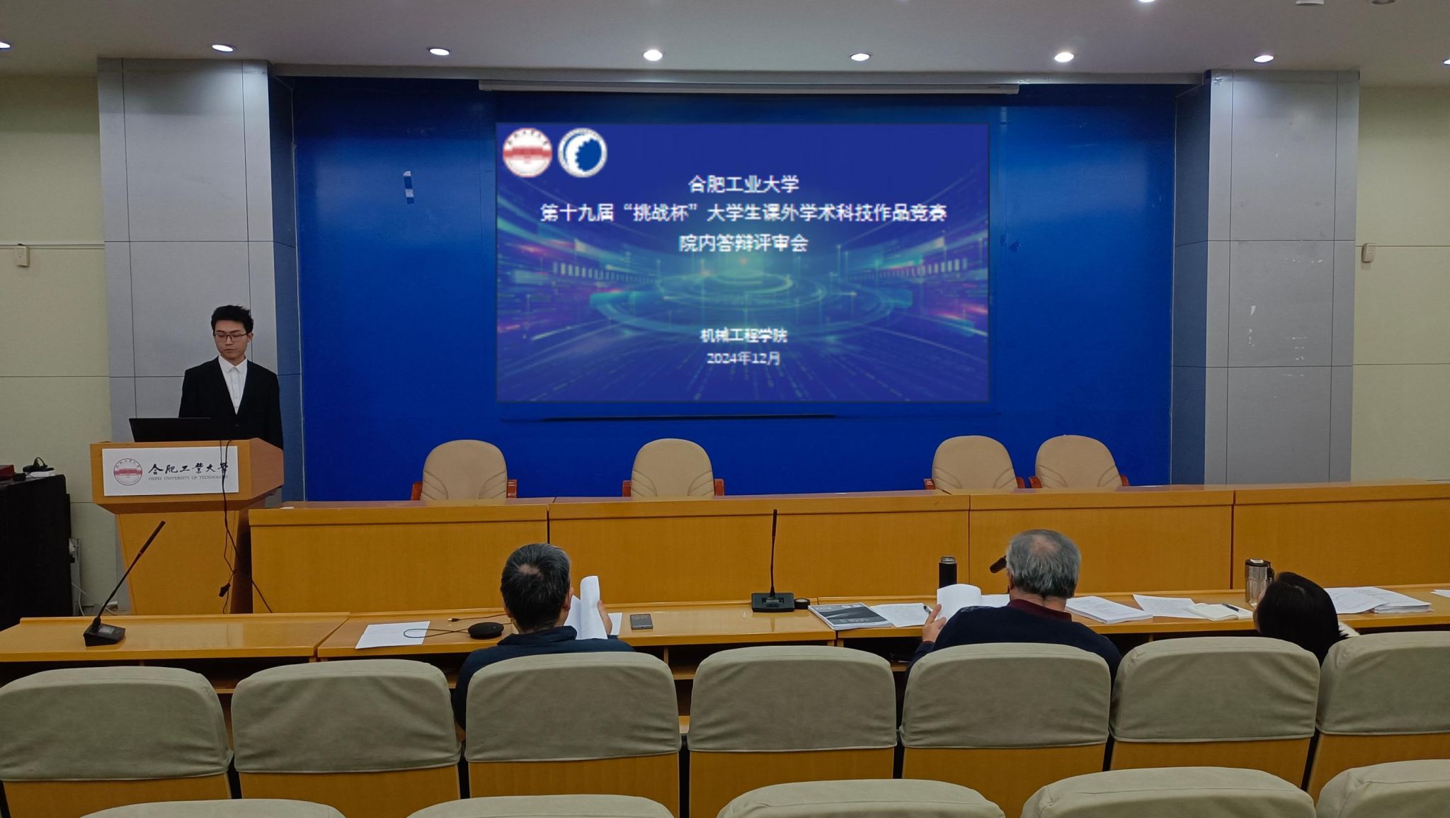 12月31日下午,机械工程学院在屯溪路校区格物楼214举办第十九届“挑战杯”大学生课外学术科技作品竞赛院内答辩评审会。学院邀请了相关专业老师担任评委。