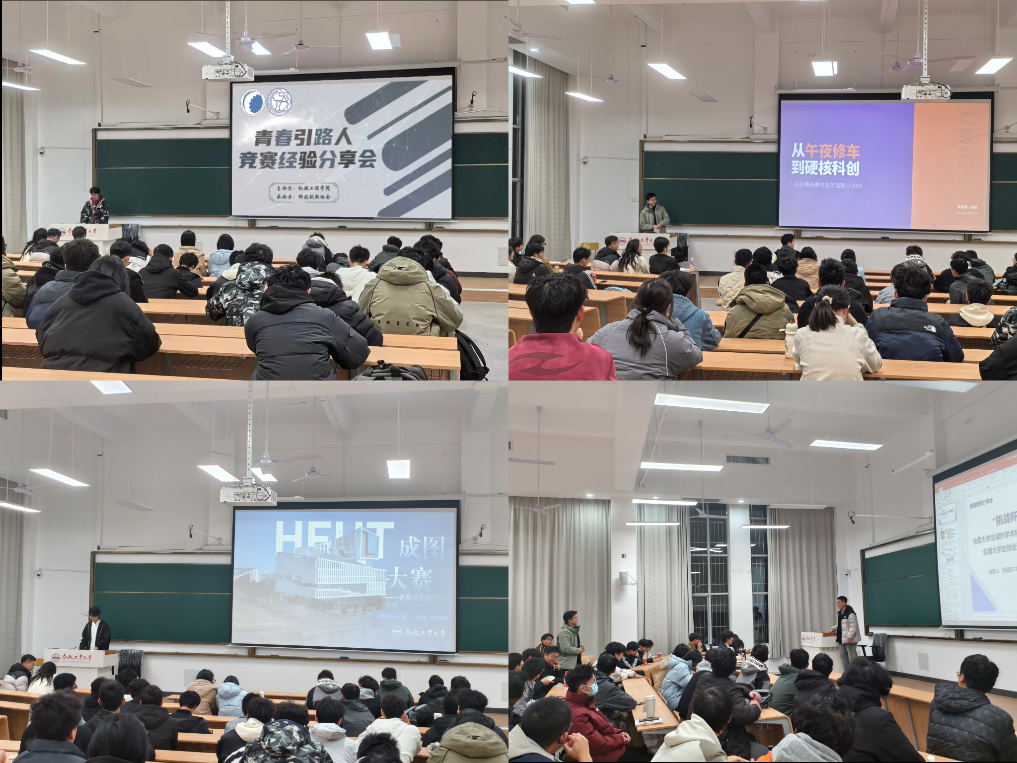 分享环节中,五位同学结合自身参赛实战经历,分别聚焦 “挑战杯” 系列赛事、中国国际大学生创新大赛、机械创新设计大赛、工程训练综合能力竞赛、大学生先进成图技术与产品信息建模创新大赛五大机械专业相关的核心赛事。他们从赛事选题逻辑、团队组建技巧、备赛时间轴规划,到作品打磨的关键细节、答辩临场应对策略等维度深入拆解,既点明了各赛事的核心考察重点,也坦诚分享了自己作为选手在备赛路上的难点瓶颈与破局方法。