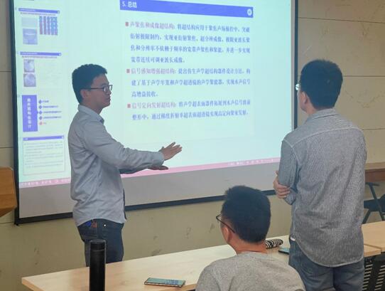 马富银老师以“装备部件和器件超构化设计及应用初探”为题为参会师生作了精彩详实的报告。报告概括了近几年团队在飞机、高铁、船舶等机械装备轻量化低频减振降噪的工程应用需求及声呐装备远程探测和通信需求牵引下,面向装备防、攻性能提升需求,从装备隐身(减振降噪)和探测方面分别入手,围绕重大装备(分为部件+器件)“轻”、“小”、“高”(即轻量化、小型化、高性能化)设计中面临的低频机械波调控核心问题开展的系列应用基础研究工作。装备部件超结构化方面,涉及薄壁板壳轻量化隔声部件设计、超轻低频宽带吸振部件设计和薄层低频宽带吸声部件设计。装备器件超结构化方面,涉及仿生声学感知器件设计、亚波长聚焦及宽带聚焦器件设计、超分辨成像及宽带连续可调成像器件设计、基于声学聚能器的水声信号接收增强器件设计、基于超表面自准直聚束的水声信号定向发射器件设计等。并在部件和器件超构化方面开展了相应的应用探索,取得了阶段性的进展。