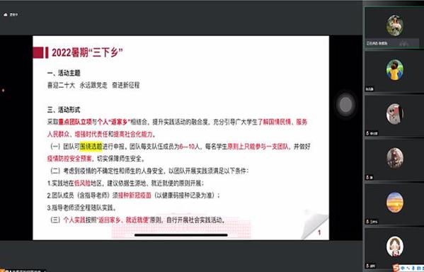 6月10日下午,学院相关老师通过线上平台召开2022年暑期“三下乡”社会实践动员会,负责老师向同学们解读了《关于开展合肥工业大学2022年大学生暑期“三下乡”社会实践工作的通知》,详细介绍本次社会实践活动的各项安排,并以往年优秀团队的实践活动为例,引起学生重视,激发学生兴趣,帮助同学们进一步了解活动政策。会议中,同学们积极发言,提出疑问。会后,辅导员老师认真解答同学们的问题,并号召同学们积极参与。