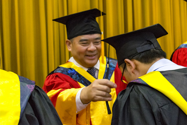 随后,在隆重的加冕进行曲中,老师们为获得学士学位的全体学生颁发学位证书,扶正流苏,并合影留念。