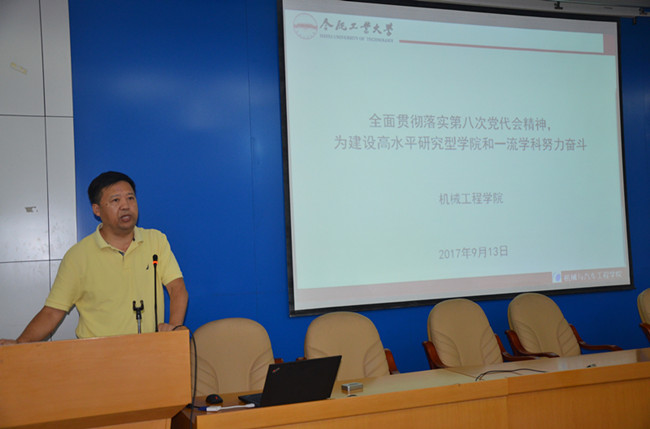 院党委书记韩江作了题为《全面贯彻落实第八次党代会精神,为建设高水平研究型学院和一流学科努力奋斗》的报告,他首先带领全院教职工重温了校第八次党代会的主要内容和重要精神,结合学校“三步走”的战略目标,提出英国上市公司365 “三步走”战略,力争在建校100周年之际,机械工程学科进入世界一流学科前列,实现国际知名的研究型高水平学院建设目标,从全面加强党的建设、确保学院各项事业持续健康发展和依托学院实际、培育和强化特色、落实六大发展任务两个大的方面,就学院如何贯彻落实第八次党代会精神的措施方案进行了的详细解读和布置。