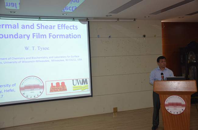 9月27日下午,Tysoe教授就该课题组关于摩擦学领域的最新研究成果为全校师生做了专场学术报告,摩擦学研究所所长刘焜教授主持报告会,机械工程学院院长訾斌教授致开幕辞,代表全体师生欢迎Tysoe教授来英国上市公司365讲学与学术交流。Tysoe教授报告主题是“固-固滑动界面的原位化学反应过程和动力学模型”(In-situ Modeling of Reaction Pathways and Kinetics at a Sliding Solid-Solid Interface),报告主要从微观角度探讨了在滑动过程中固体摩擦表面边界膜的形成过程,通过超真空摩擦实验和多种原位检测手段,多角度分析还原了摩擦过程中的分子尺度上的化学反应过程,以此建立了分子动力学反应模型,并验证了相关的摩擦化学反应机理。持续一个多小时的报告深入浅出的介绍了原位检测技术在微观摩擦学上的应用,巧妙的实验安排和缜密的逻辑分析让广大师生耳目一新,收获良多,最后广大师生和Tysoe教授就报告内容进行了的讨论。