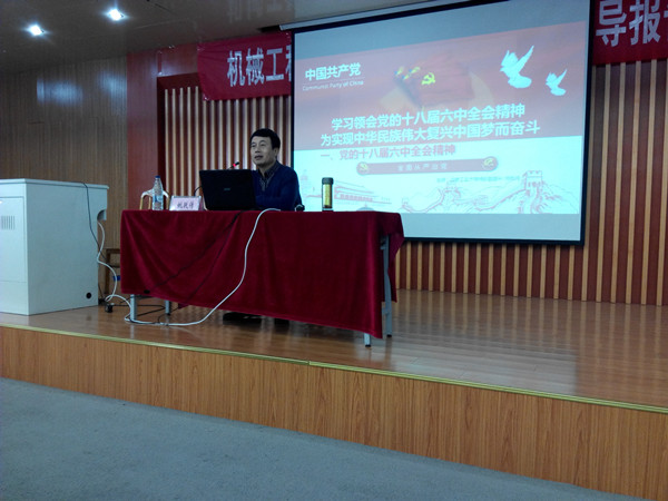 为深入学习贯彻党的十八届六中全会精神,继续深化“两学一做”学习教育,11月30日下午,机械工程学院于机械楼214邀请校十八届六中全会精神宣讲团成员、校党委统战部部长姚跃传做了题为《学习贯彻十八届六中全会精神、为实现中华民族伟大复兴的中国梦而努力奋斗》的报告。本次报告会由机械工程学院党委副书记、副院长郑召丽主持,该院学生党员和党校第56期学员近300人聆听了报告会。