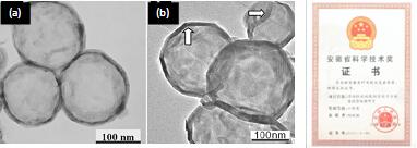 (a)780oC,(b)960oC脱硫制备的MoS2空心微球TEM照片以及(c)获奖证书