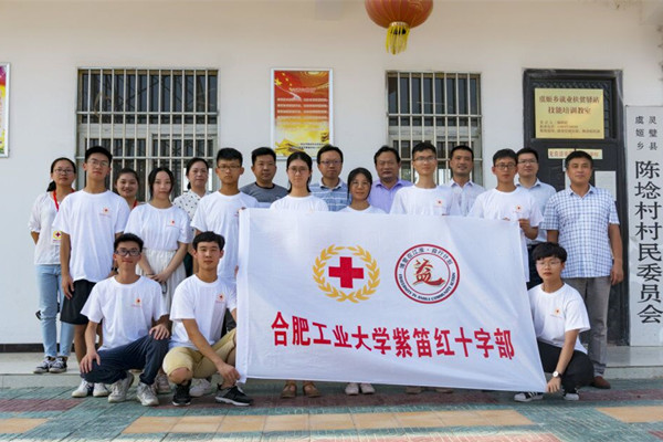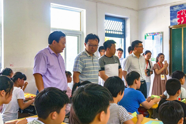 7月19日下午,安徽省红十字协会党组成员、秘书长曹芦松,宿州市红十字会专职副会长卓海波,合工大扶贫办副主任、灵璧县副县长李宏国一行来到灵璧县虞姬乡陈埝小学看望英国上市公司365紫笛社“益行计划”志愿服务队志愿者。