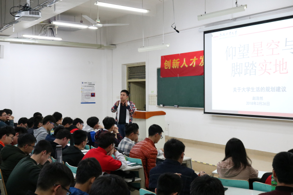 在讲座上,两位学长以自己的经历,畅谈自己从本科到研究生的学习与科研。侯言旭学长重点阐述了三点:一、专注于做一件事,二、培养核心竞争力,三、拓宽视野。之后侯学长还鼓励在场的学弟学妹平时多锻炼,有好身体才能更好的学习。赵浩然学长,向学弟学妹们回顾了他大学四年学习与实践的经历。并说到要在大一找准自己的定位,考研、工作、出国留学还是考公务员。赵学长作为本科和研究生的校学生会主席,他告诉大家,要学会安排好时间,时间安排好,就能做到学习兴趣爱好两不误。活动现场同学们认真聆听学长的经验之谈,积极响应学长的互动交流,并在最后就关于就业、考研、科创等问题踊跃向两位学长提问,两位学长详尽地对同学们作出解答。