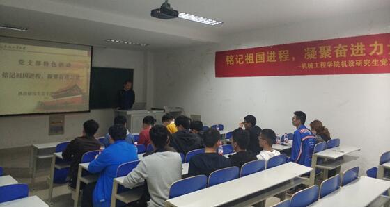 为进一步提升大学生爱国情怀,奉献精神,激励广大学生党员不忘初心,牢记使命,争做新时代优秀青年。4月27日,机械工程学院机械设计及理论研究生党支部在格物楼620教室开展了“铭记祖国进程 凝聚奋进力量”主题教育学习活动。
