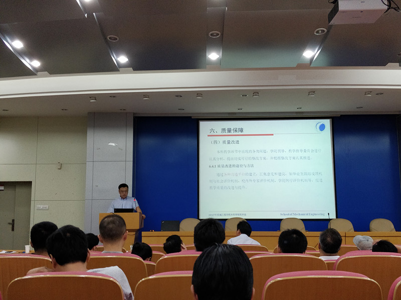 2018年7月23日下午14:00-18:00,机械工程学院在格物楼二楼学术报告厅召开全员教师大会进行2018年本科教学审核评估动员工作,会议由黄康副院长主持,訾斌院长,韩江书记,黄海鸿副院长,左登发副院长,郑召丽副书记,各系主任以及全院教职工参加了大会。